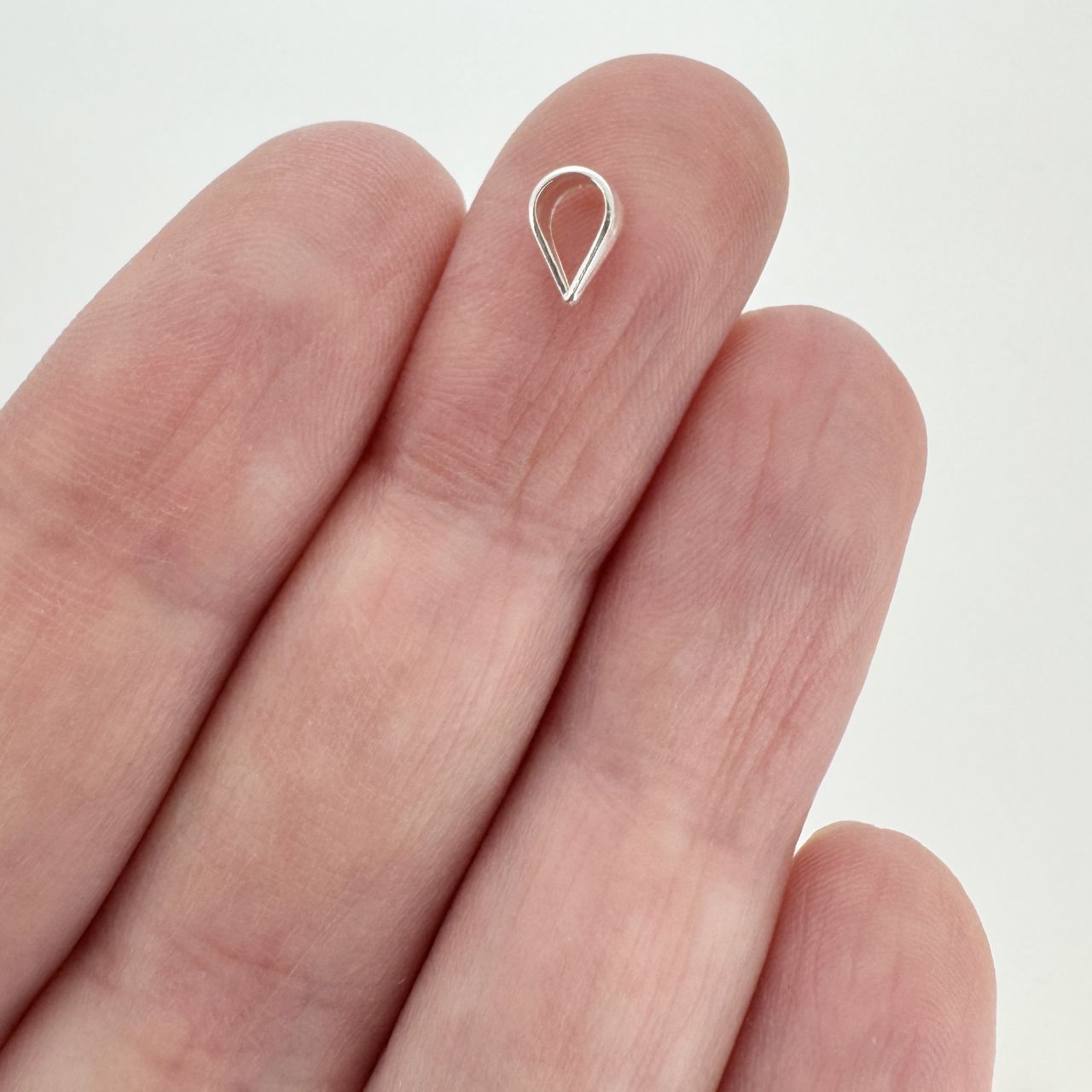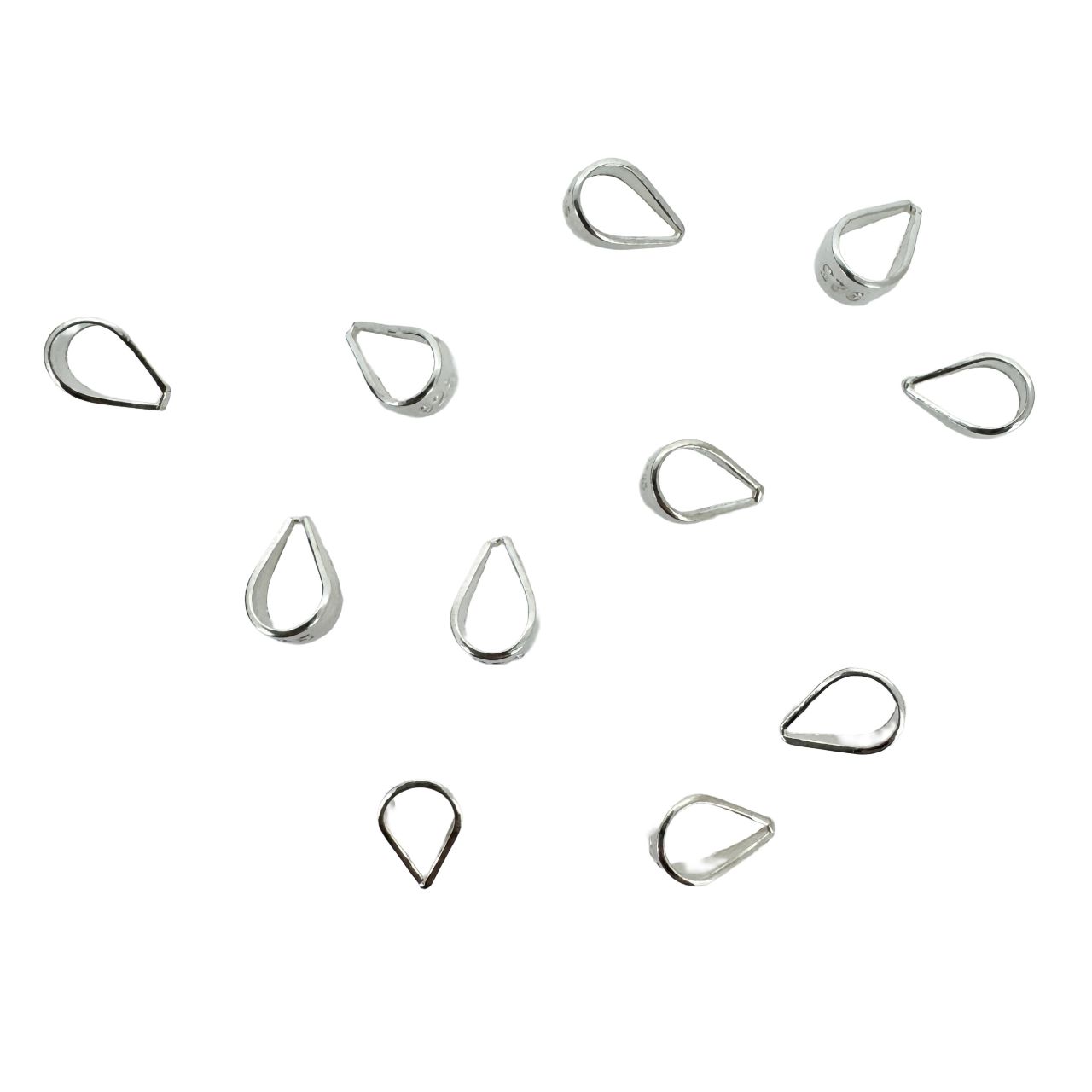 Material: .925 Sterling Silver. Shape: Teardrop shape bail. Smooth surface. "925" mark on the loop - Closed BailOuter Loop: 7.2mm Length, 5.2mm wide, 0.5mm thickInner Loop: 5.2mm Length, 4mm wideQuantity: 10 piecesPictures show the shape of the product, for actual size, please read the measurement.