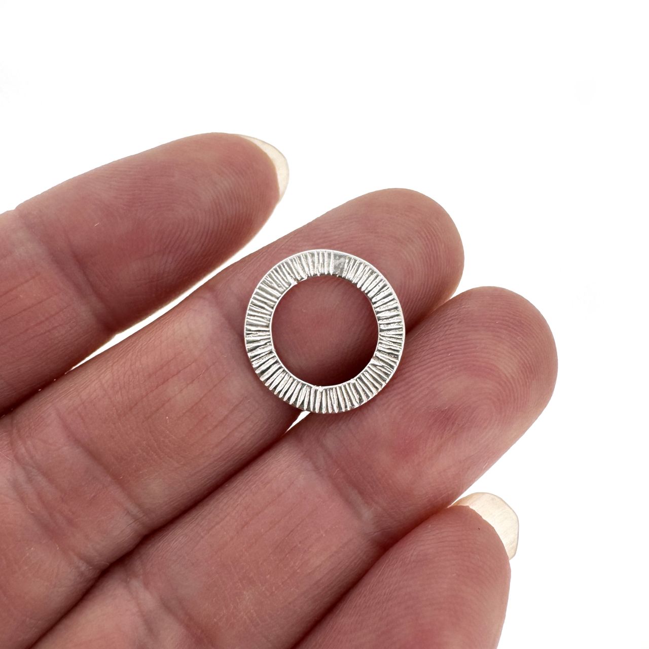 Material: Solid Genuine .925 Sterling Silver. Shape: Textured round charm or connector, double-sided textureMeasurement: 14mm outer diameter, 9mm inner diameter, 2.4 by 0.8mm thicknessQuantity: 1 pc