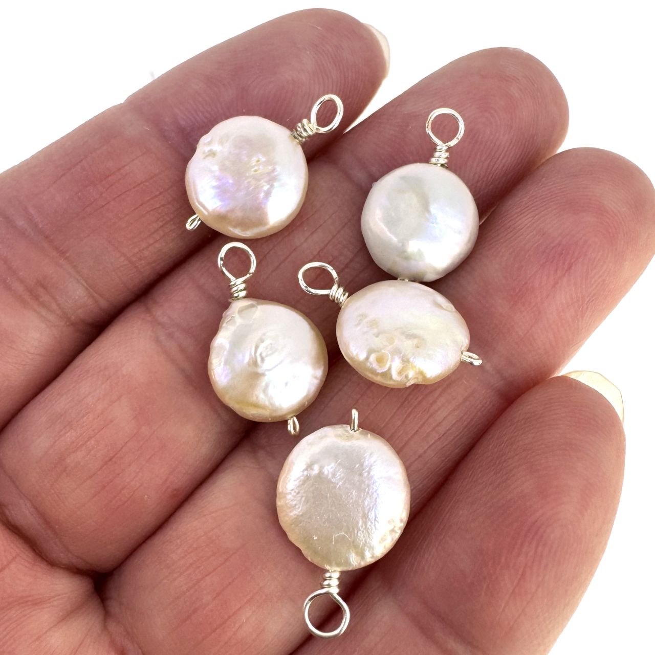 Material: Peachy pink freshwater pearls, wire wrapped with Non-Tarnish Artistic Wire, the color will be shiny forever.Size: Pearls are 11-12mm diameter, 4mm thickColor: peachy pinkShape: Coin, Flat RoundQuantity: 5 pieces per bag.